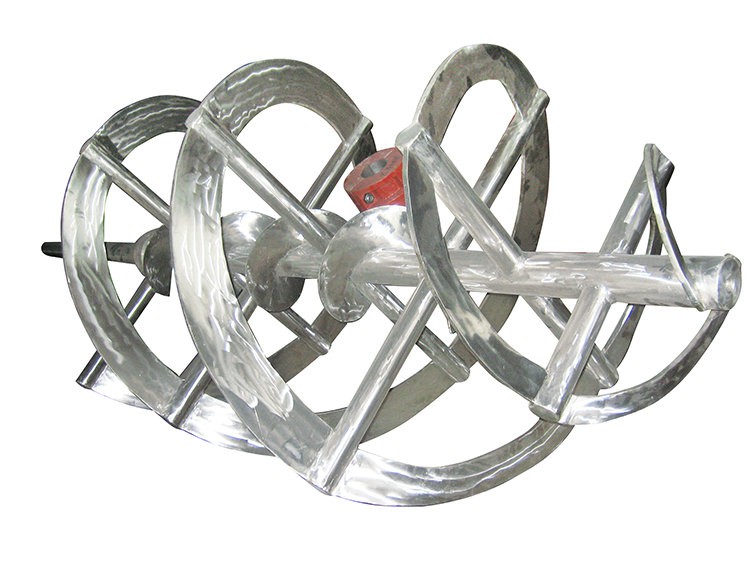 >低速型槳,循環優良型槳,高粘度型槳,軸向流槳。物料沿著螺旋面上升或下降形成軸向的上下循環。一般是近罐壁上升,中軸匯合下壓。適用于高粘度介質的傳熱、混合、溶解反應等過程。此類攪拌器應用于特高粘度介質攪拌。桿螺帶(俗稱螺桿)是螺帶的特殊型式,直徑小沿軸引成螺帶與外螺帶配合應用時方向相反可強化軸向循環。